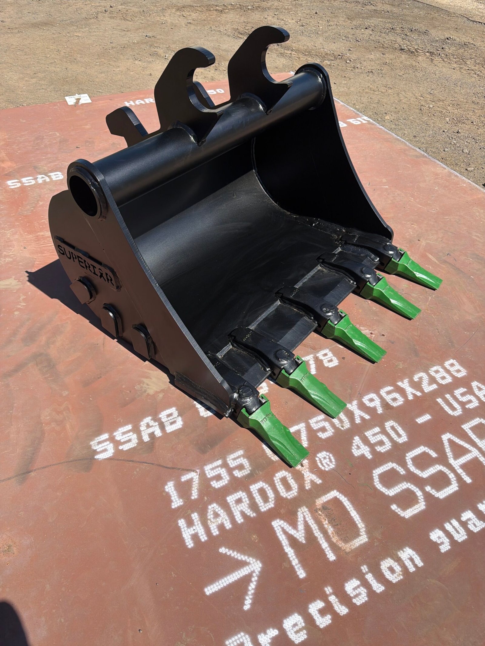 Built with Hardox® steel, this bucket is designed for heavy digging and high-production work. Outfitted with a ESCO V-Series tooth system, which is stronger, longer-lasting, and more reliable than most OEM tooth setups.
