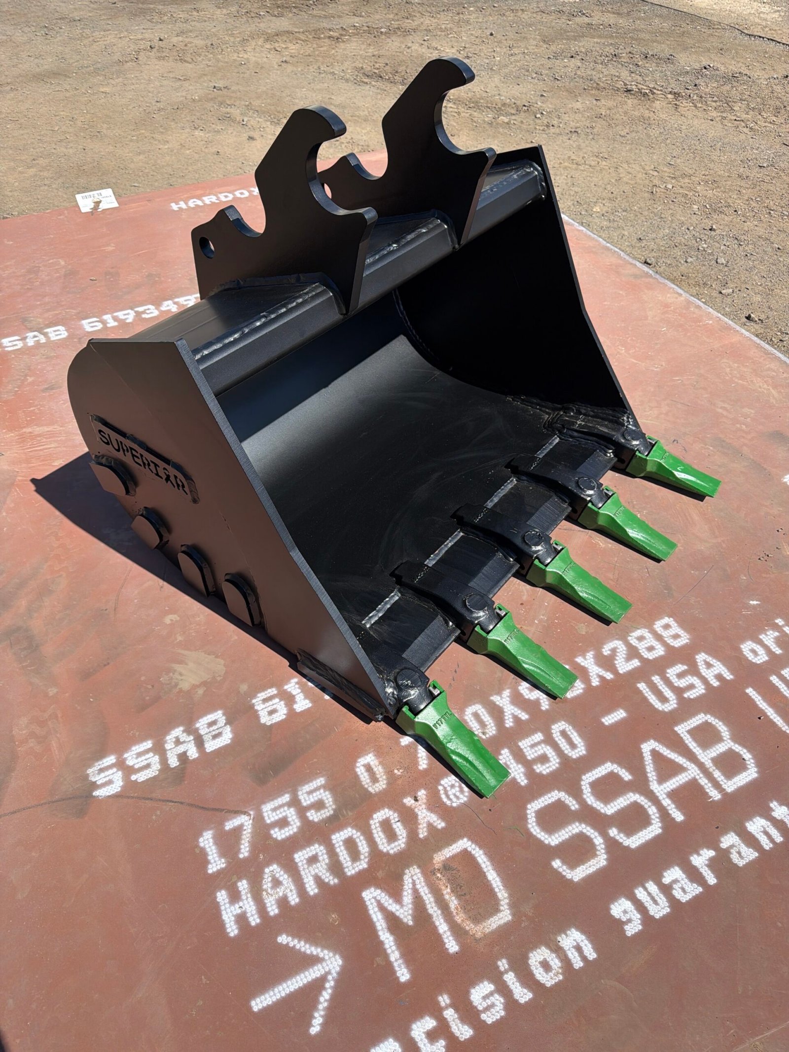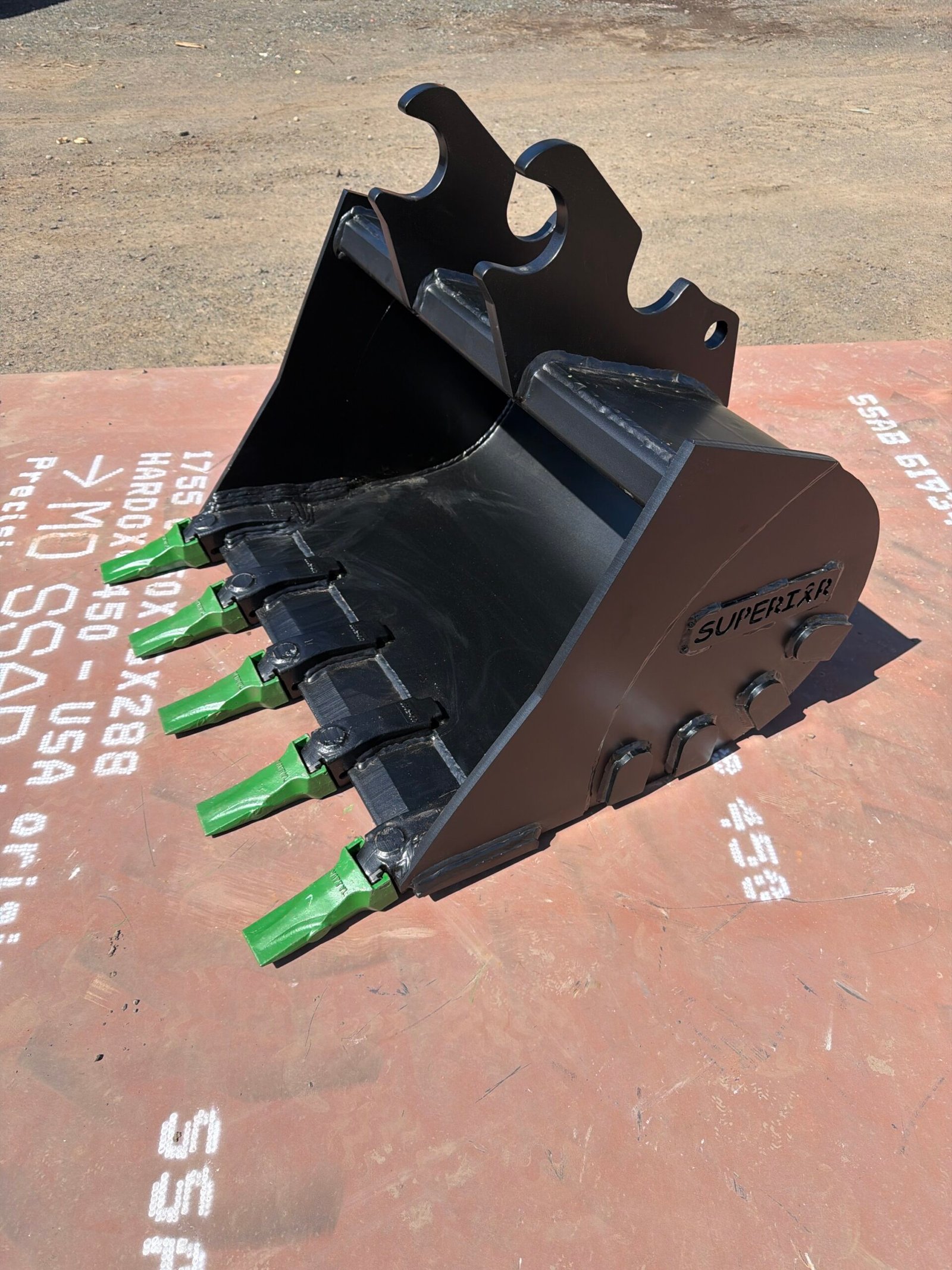 30-inch heavy-duty digging bucket for Kubota KX040. Features Hardox steel construction and ESCO V-Series teeth for superior jobsite performance.